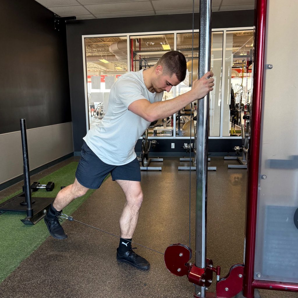 Very specific to skating, this exercise develops leg strength in a unilateral stance, while improving pelvic control and stability.