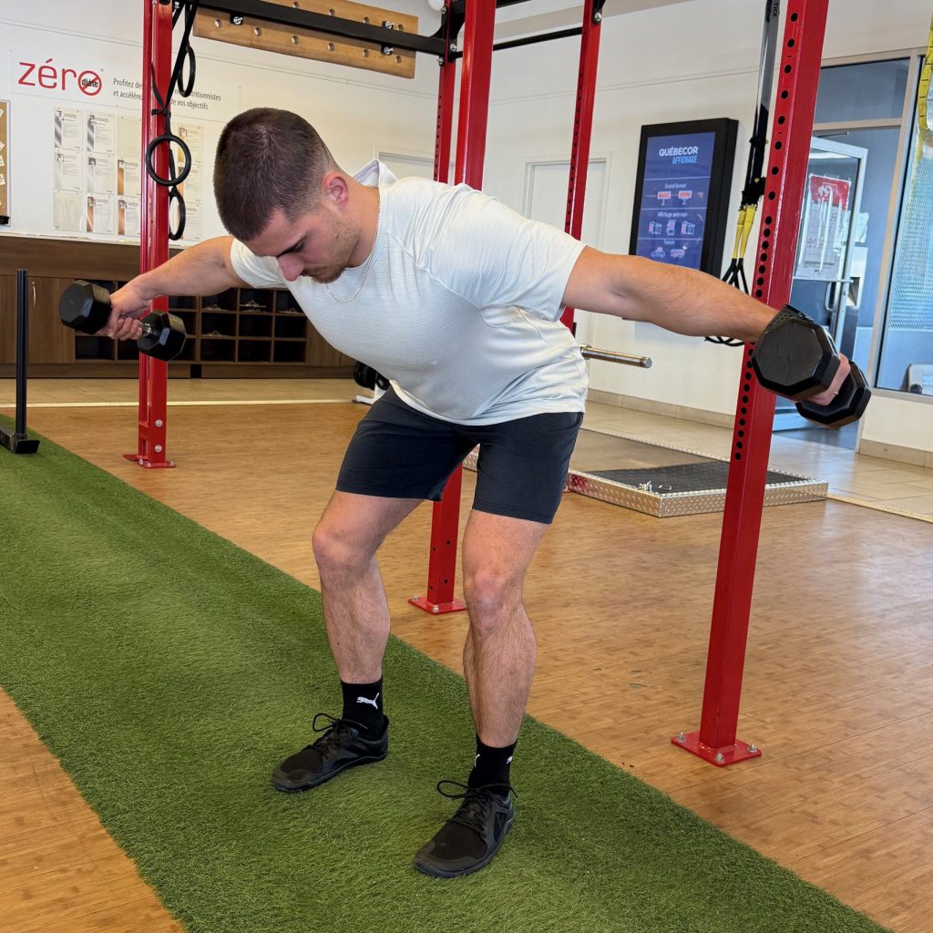 The reverse fly strengthens the upper back and promotes better posture. A strong back allows for more effective pushing with the poles and reduces tension in the shoulders and neck.